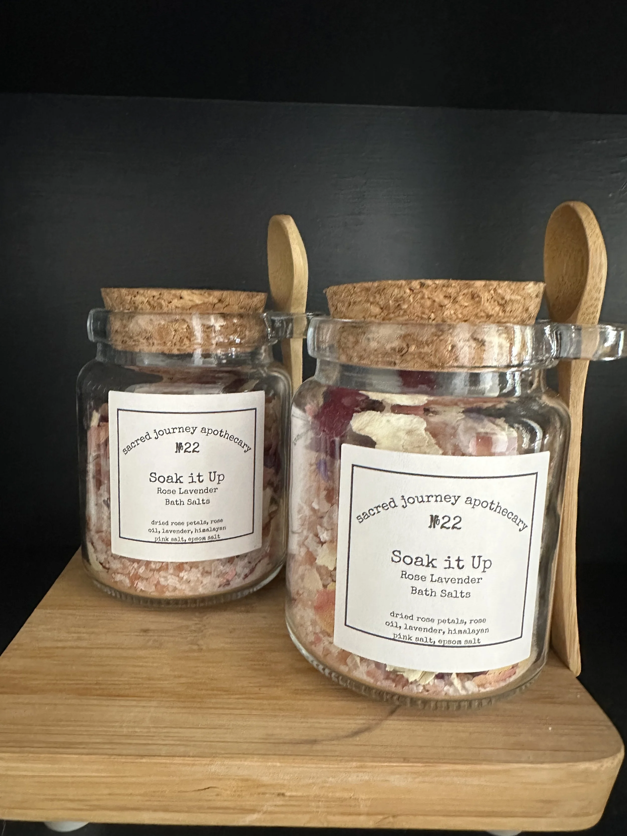 Soak It Up, our luxurious Rose & Lavender Bath Salts.- Crafted with the finest Himalayan salt, this sacred blend detoxifies, soothes tired muscles, and restores balance to your body and spirit.