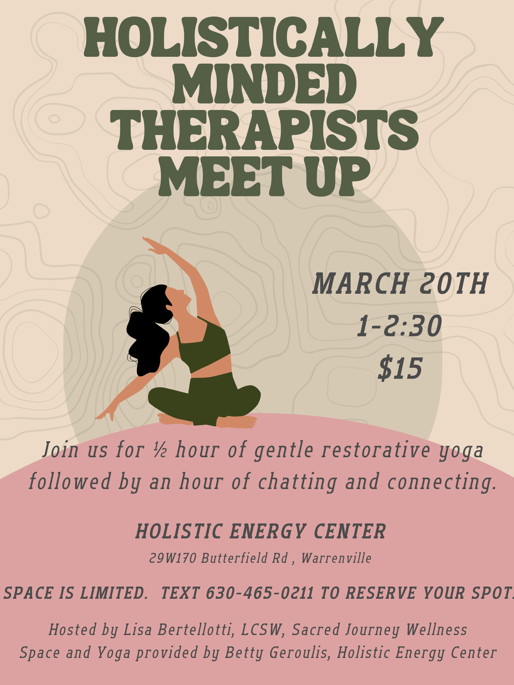We will start with a gentle and restorative yoga and breathwork session with Betty Geroulis followed by a chance to chat, connect and network with like minded therapists. Hopefully this event will be the first of many! Space is limited. Call or text 630-465-0211 to reserve your spot.